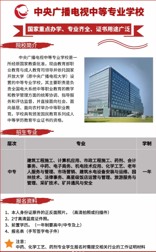 報名條件:報名人員須年滿18周歲,一年制電大中專需要持有高中畢業證書,兩年制需要持有初中畢業證書。