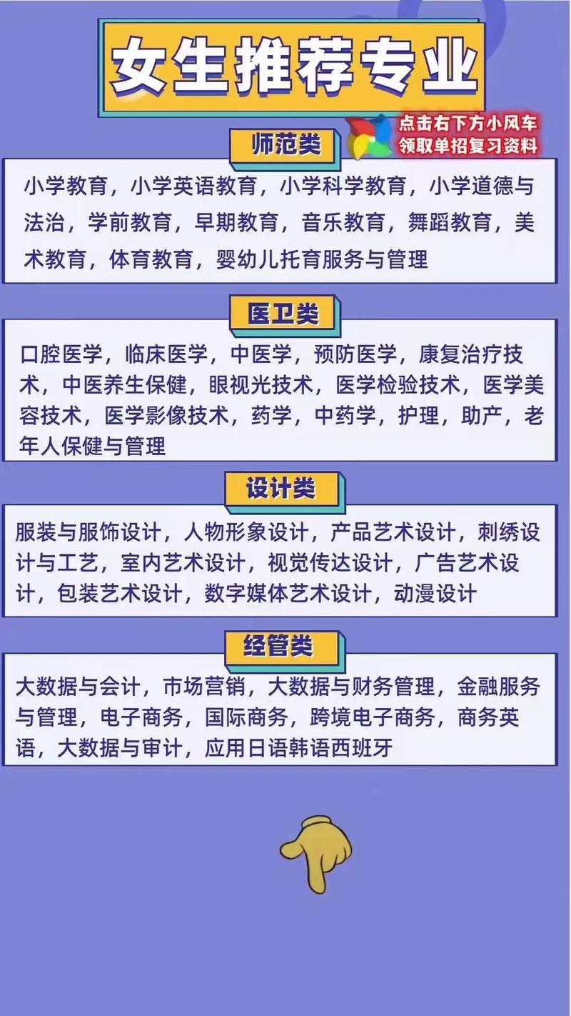 ?女生推薦大類?:藥品生產技術、藥品生物技術、生物制藥技術、動物醫學;學前教育、小學教育、早期教育、小學科學教育;護理、助產、口腔醫學技術、醫學檢驗技術、眼視光技術等?。