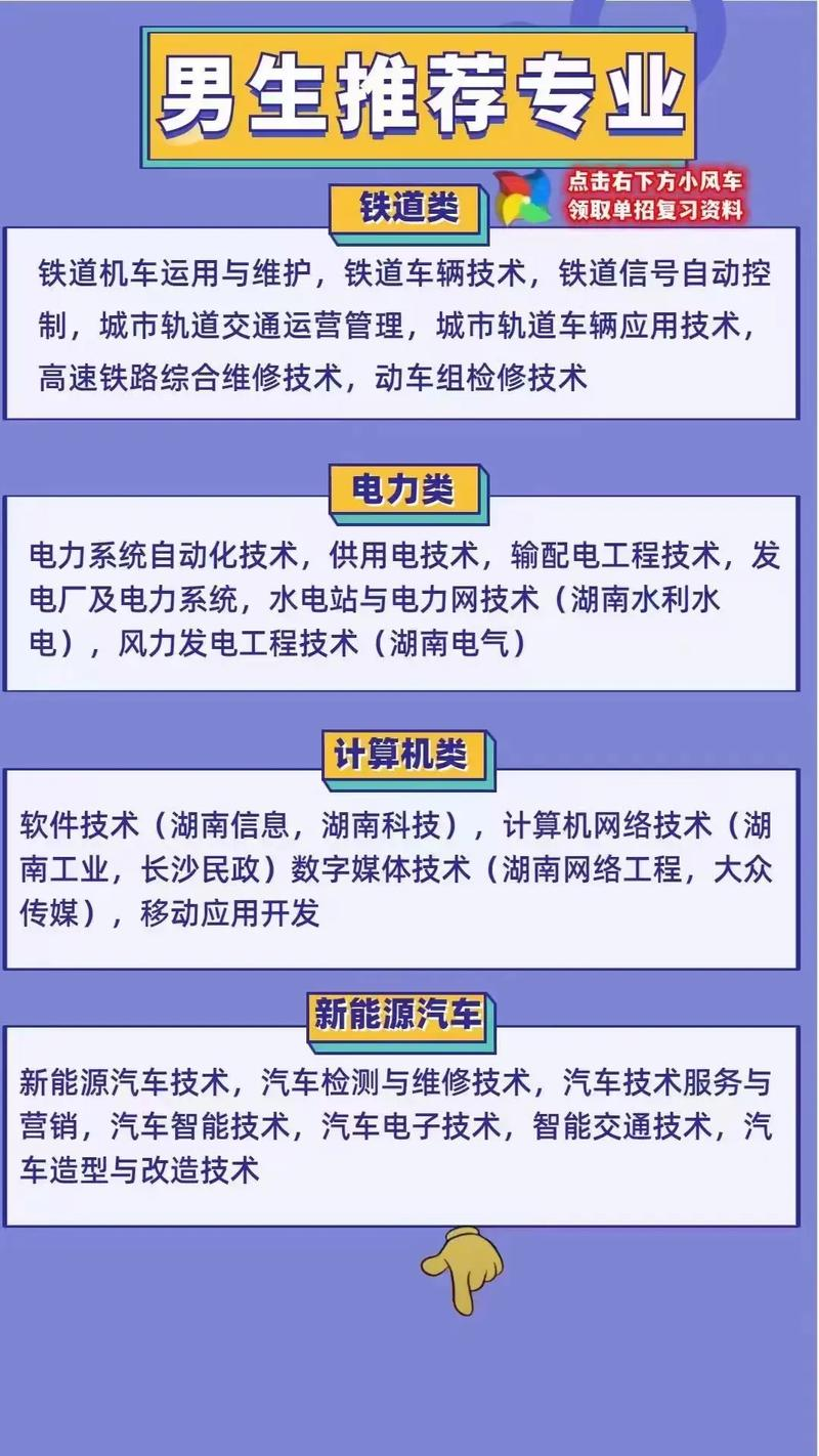 ?男生推薦大類?:工程造價、建筑工程技術、建設工程管理、建筑電氣工程技術;城市軌道交通機電技術、城市軌道交通運營管理、城市軌道交通工程技術、智能交通技術、供用電技術、發電廠及電力系統;機械制造及自動化、新能源汽車技術、機電一體化技術等?。
