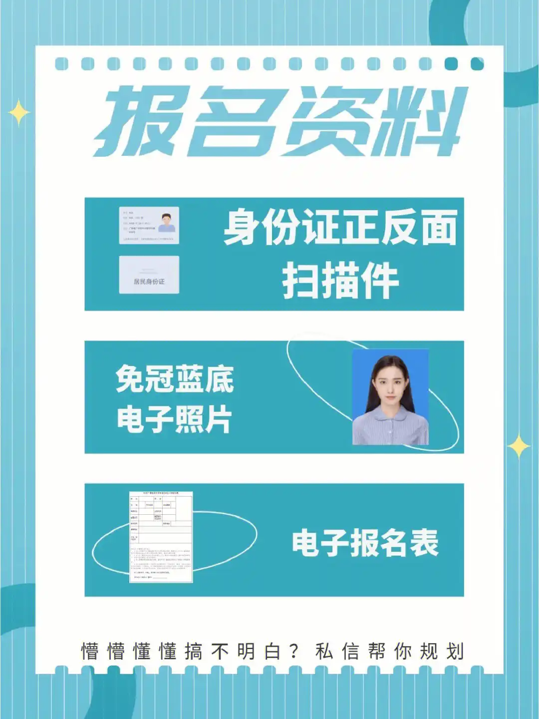 近期免冠照片:照片通常用于制作學生證、畢業證書等證件。報名時需準備2張一寸或二寸彩色照片,照片背景一般要求為藍底或白底,電子版照片也需要準備,用于在線報名系統上傳。