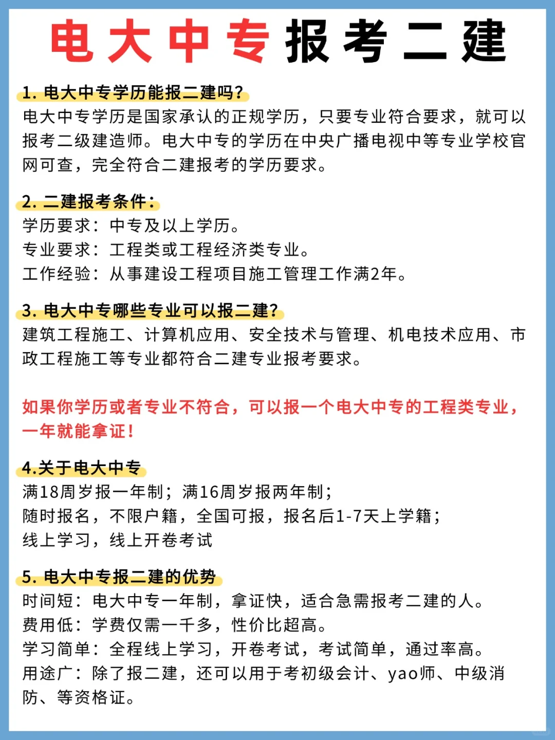 升學途徑:電大中專畢業生可以通過自考、成人高考、開放教育等方式繼續提升自己的學歷水平。同時,該證書也可以作為報考職業資格證書(如二級建造師、初級會計師等)的前置學歷條件。