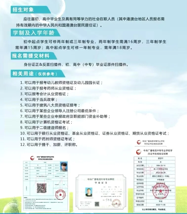 學歷認證:可通過中央廣播電視中等專業學校的官網查詢學籍和學歷,同時可打印學歷驗證報告。