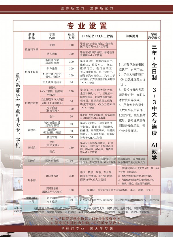 升學通道:可通過對口高考升入安徽職業技術學院、合肥職業技術學院等高校。
