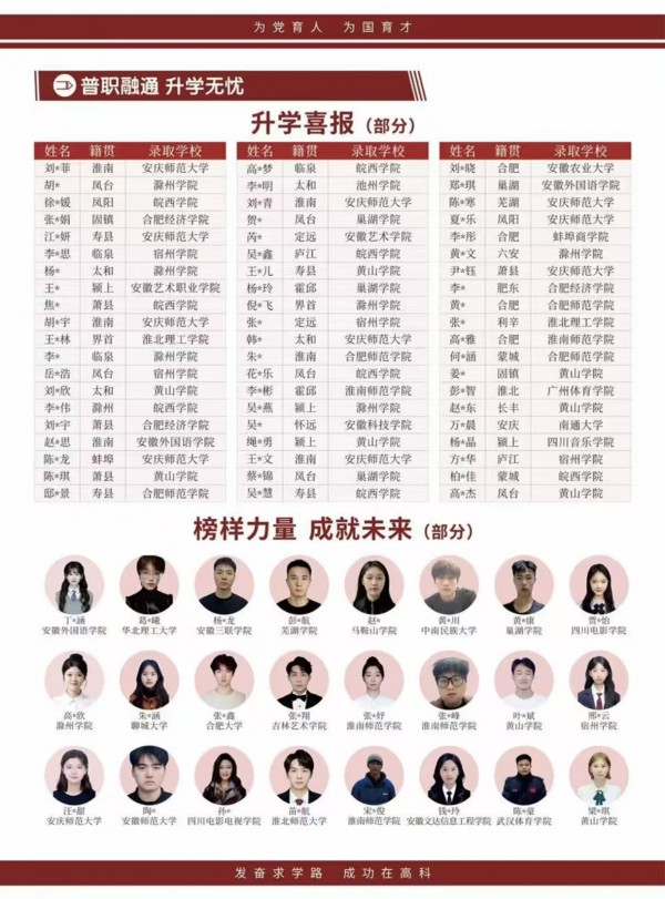 學校與淮南師范學院、合肥職業技術學院、安慶師范大學等省內多所優質高職院校建立長期穩定合作關系,打造“3+3”中大專連讀項目,助力學子低門檻升入大專院校: