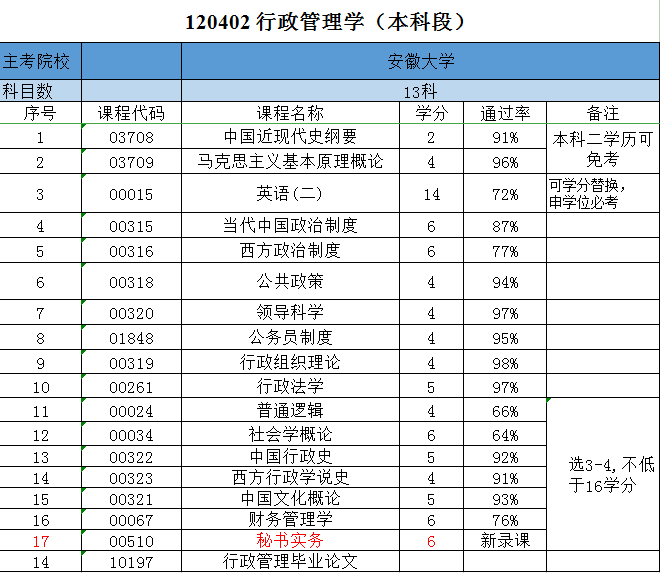 安徽大學自學考試專升本行政管理專業的考試科目共包括14門,具體如下: