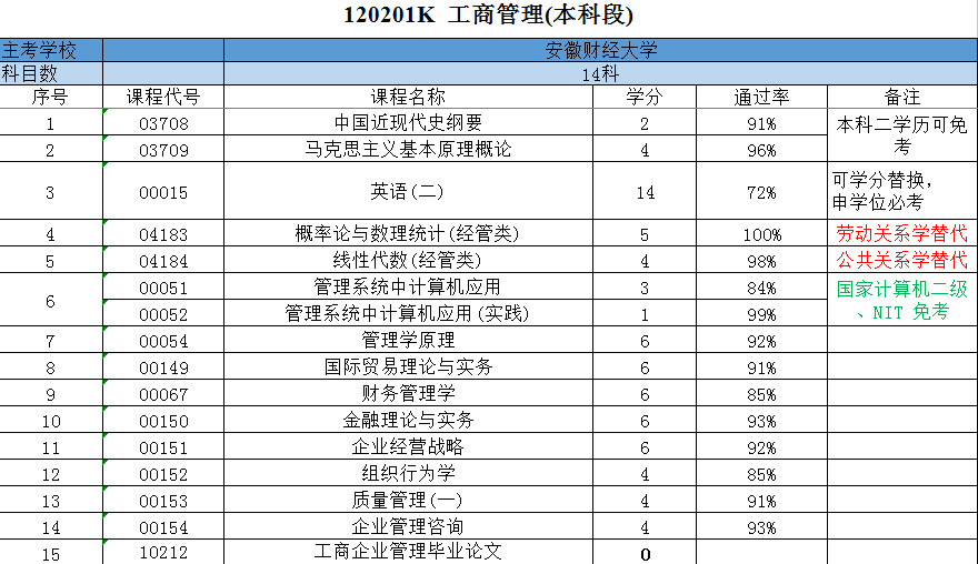 安徽財經大學成人自考專升本工商管理專業的考試科目包括統考筆試科目和助學加分考核。具體統考筆試科目可能包括: